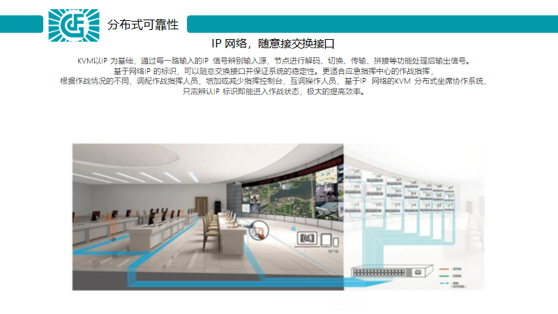 (四)兼顧網(wǎng)絡(luò)差異,滿足低帶寬原生畫質(zhì)呈現(xiàn)。數(shù)據(jù)信息的高清傳遞是支撐智慧城市服務(wù)協(xié)同管控、精準(zhǔn)施策的關(guān)鍵。在一定的網(wǎng)絡(luò)環(huán)境下,帶寬是有限的,攝像頭視頻或許可以透過降低畫面品質(zhì)來提供穩(wěn)定的服務(wù),但是一旦加大屏幕內(nèi)容的壓縮率,失真會馬上導(dǎo)致字體的清晰度下降,這對于數(shù)據(jù)信息和畫面細(xì)節(jié)的呈現(xiàn),有著比其他領(lǐng)域、部門更加嚴(yán)苛要求的指揮中心而言,是不被允許的。KVM以IP 為基礎(chǔ),通過每一路輸入的IP 信號辨別輸入源,節(jié)點(diǎn)進(jìn)行解碼、切換、傳輸、拼接等功能處理后輸出信號。基于網(wǎng)絡(luò)IP 的標(biāo)識,可以隨意交換接口并保證系統(tǒng)的穩(wěn)定性。更適合應(yīng)急指揮中心的作戰(zhàn)指揮,根據(jù)作戰(zhàn)情況的不同,調(diào)配作戰(zhàn)指揮人員,增加或減少指揮控制臺,互調(diào)操作人員,基于IP 網(wǎng)絡(luò)的KVM 分布式坐席協(xié)作系統(tǒng),只需辨認(rèn)IP 標(biāo)識即能進(jìn)入作戰(zhàn)狀態(tài),極大的提高效率。