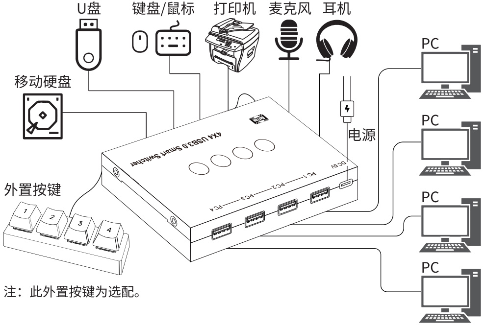 4X4 USB3.0共享器可以實現4臺電腦共享四個USB3.0接口的設備,如打印機、鍵盤、鼠標、多功能一體機等USB3.0的外接設備??梢酝ㄟ^共享器達到多臺電腦共享四個設備的目的,附帶USB聲卡功能,支持耳麥輸出音頻,并支持RS232通訊控制切換通道。即插即用,高兼容性,無需額外的驅動程序即可開始使用??蓮V泛應用于娛樂游戲、證券場所、視頻會議、多媒體教學、安全中心、數據控制中心、信息分配等環(huán)境,讓辦公、娛樂更暢快。