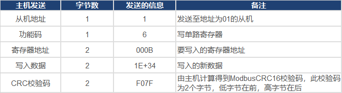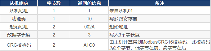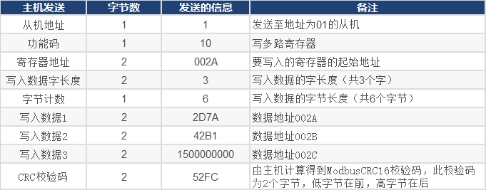 例如:主機要把數(shù)據(jù)2D7A、42B1、15E8保存到地址為002A、002B、002C的從機寄存器中去(從機設(shè)備地址為01)。