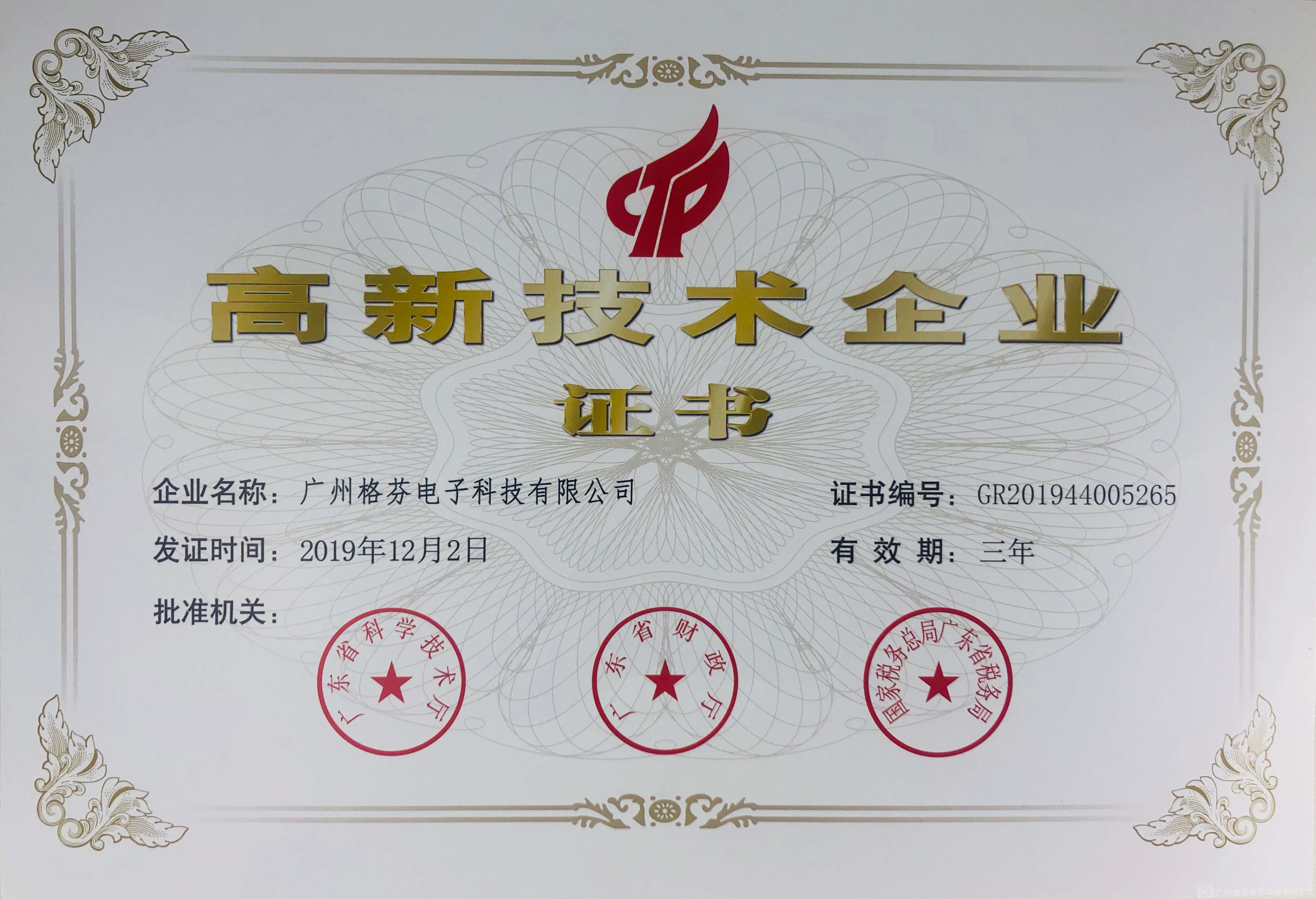 廣州格芬電子科技有限公司連續(xù)9年順利通過(guò)廣東省高新技術(shù)企業(yè)認(rèn)定工作,榮獲了由廣東省科學(xué)技術(shù)廳、廣東省財(cái)政局、廣東省國(guó)家稅務(wù)局和廣東省地方稅務(wù)局聯(lián)合頒發(fā)的《高新技術(shù)企業(yè)證書》以及順利通過(guò)中國(guó)質(zhì)量認(rèn)證中心CCC產(chǎn)品認(rèn)證監(jiān)督審核。