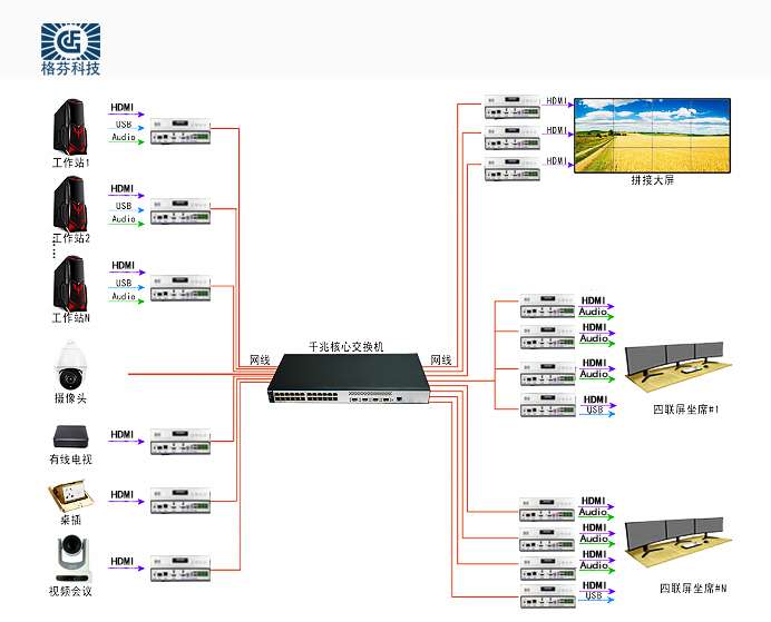 各單元音視頻輸入輸出一體化設(shè)計(jì),輸入輸出同時(shí)使用不影響信號(hào)傳輸,通過(guò)網(wǎng)絡(luò)便可實(shí)現(xiàn)音頻,視頻,網(wǎng)絡(luò)中控等功能;