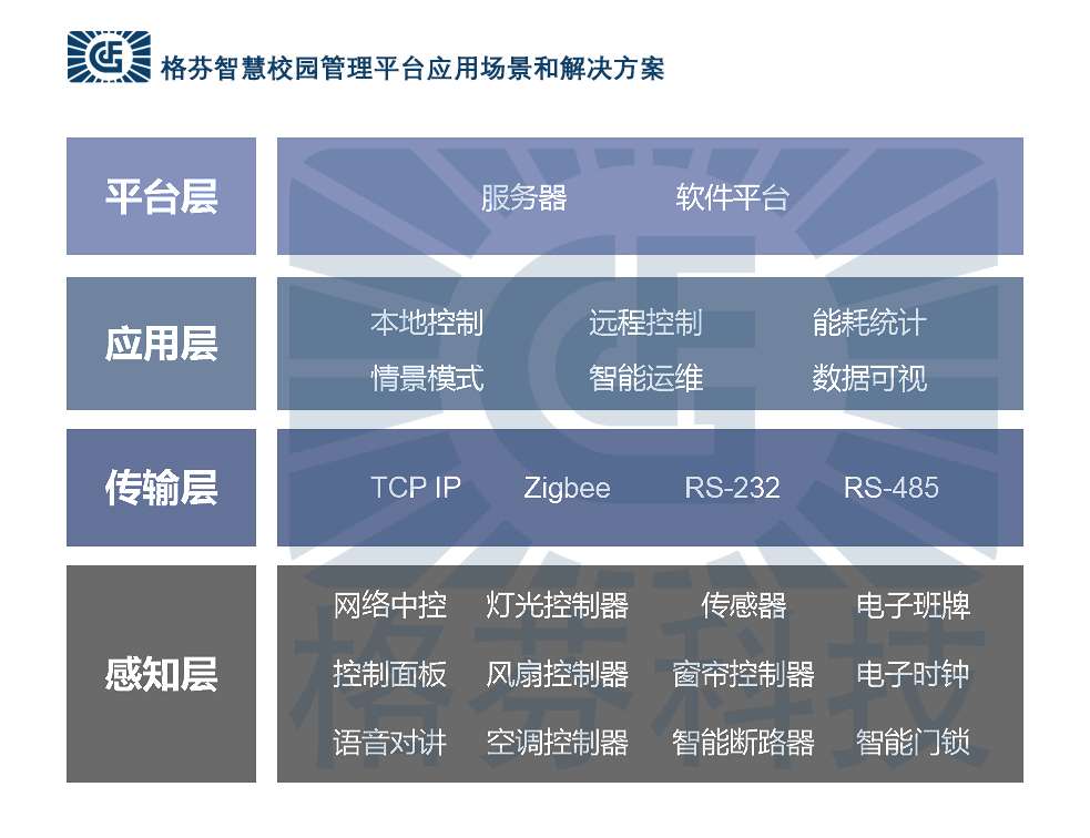 GEFFEN智慧校園管理平臺(tái)應(yīng)用場景和解決方案由感知層、傳輸層、應(yīng)用層和平臺(tái)層四部分組成,底層設(shè)備通過接入智能終端、傳感器等進(jìn)行統(tǒng)計(jì)管理和數(shù)據(jù)采集,采集數(shù)據(jù)通過網(wǎng)絡(luò)采集器網(wǎng)關(guān)等通道進(jìn)行數(shù)據(jù)回傳,回傳的數(shù)據(jù)由平臺(tái)統(tǒng)一管理展示。