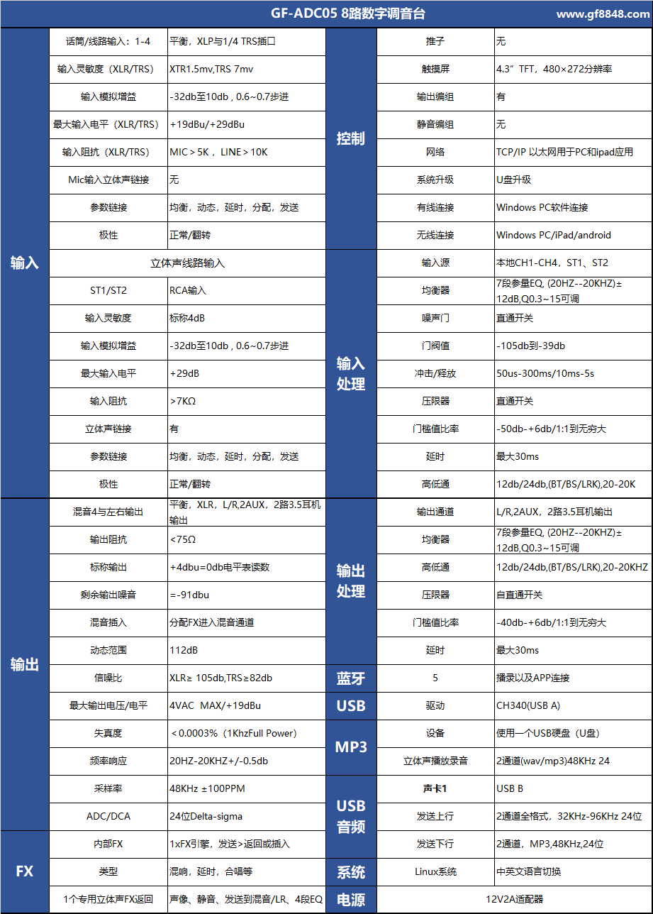 ?4路MIC/Line輸入, 2組RCA蓮花立體聲輸入,1路聲卡數(shù)字輸入(手機(jī)、電腦),1路藍(lán)牙輸入(MP3、藍(lán)牙)