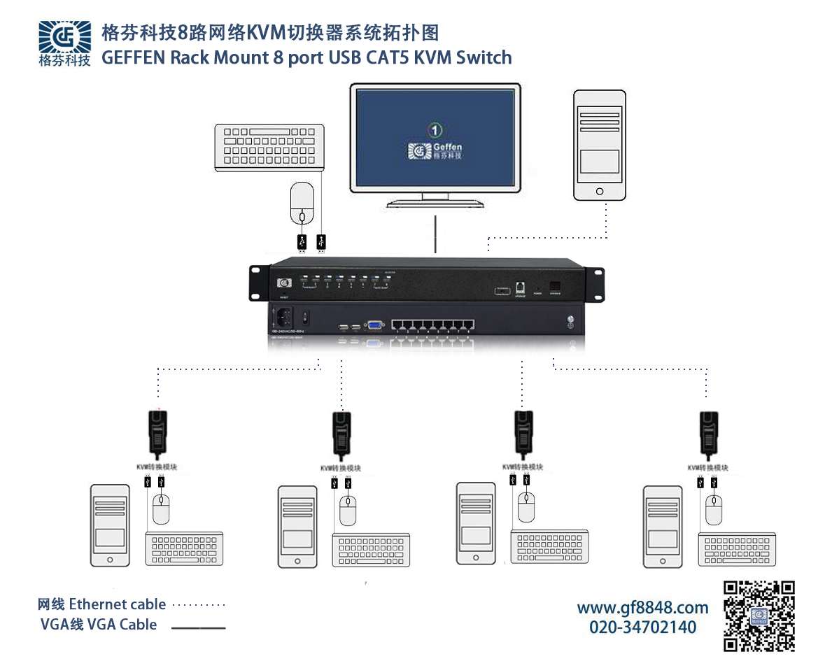 ●支持8路RJ45輸入,1路KVM輸出