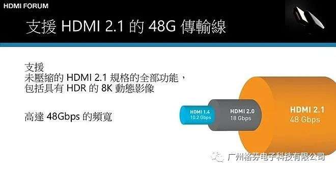 2017 年 1 月推出的最新 HDMI 2.1版本,HDMI 2.1最大的特點(diǎn)是傳輸帶寬從18Gbps大幅提高到48Gbps,支持動(dòng)態(tài)HDR、音頻回傳通道(eARC)、可變刷新率(VRR)、快速媒體切換(QMS)、 快速幀傳輸(QFT)、自動(dòng)低延遲模式(ALLM)、VESA DSC 1.2a等新技術(shù);可以支持高達(dá) 7,680 × 4,320/60Hz(8K/60p) 的影像,或者 4K/120Hz 的更高幀率影像。HDMI 2.1 將會(huì)繼續(xù)對(duì)應(yīng)返原有的 HDMI A、C 及 D 等幾種插頭設(shè)計(jì)。而且支持新的 Dynamic HDR 技術(shù),比起現(xiàn)時(shí)的“靜態(tài)”HDR,“動(dòng)態(tài)”HDR 可以因應(yīng)每一格畫(huà)面的光暗分布進(jìn)一步提升對(duì)比同光暗層次表現(xiàn)。音效方面,HDMI 2.1 支持新的 eARC 技術(shù),比起現(xiàn)有的ARC(Audio Return Channel),可以回傳 Dolby Atmos 等 Object-based 音效。
