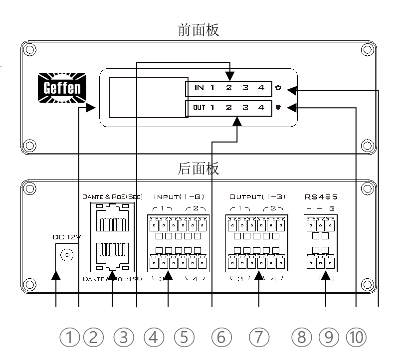 ③ 兩路Dante網(wǎng)絡(luò)接口,支持PoE供電,支持網(wǎng)絡(luò)級聯(lián),可進(jìn)行PC軟件控制。