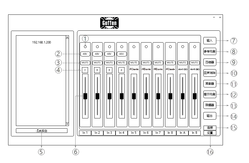 1. 使用GEFFEN?Sound Tune 軟件(處理器內(nèi)置)實施對音頻信號的參數(shù)調(diào)節(jié)。本處理器接入局域網(wǎng)后,打開PC軟件,單擊右下角搜索設(shè)備,將搜索出所有在線的音頻處理設(shè)備,并顯示對應(yīng)IP地址(默認(rèn)IP地址:192.168.1.200),選擇本處理器IP地址在右側(cè)界面進(jìn)行參數(shù)調(diào)節(jié)。
