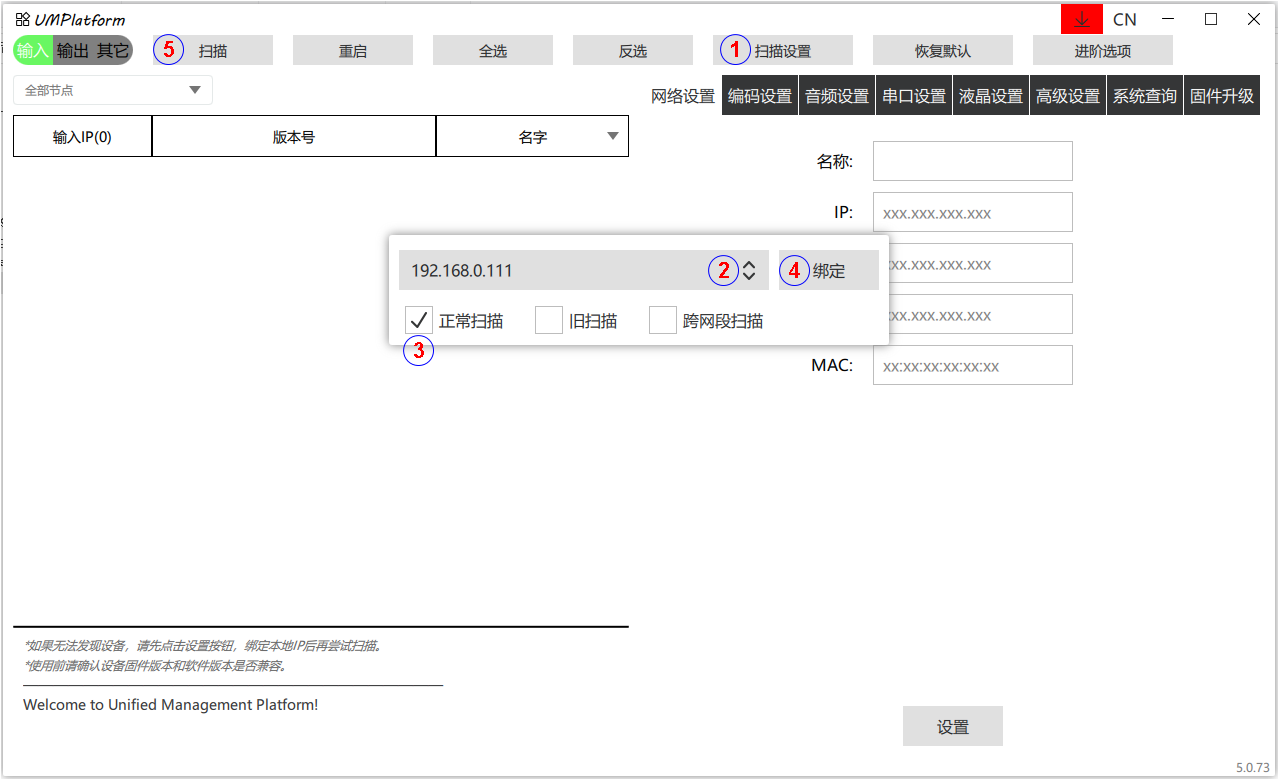 (7) 掃描設(shè)置:選擇本地網(wǎng)絡(luò)IP,設(shè)置掃描方式。同網(wǎng)段可修改參數(shù),跨網(wǎng)段掃描目的是發(fā)現(xiàn)設(shè)備。掃描到目標(biāo)IP后,把本地網(wǎng)絡(luò)IP設(shè)置與目標(biāo)IP同網(wǎng)段,從而達(dá)到可修改參數(shù)。