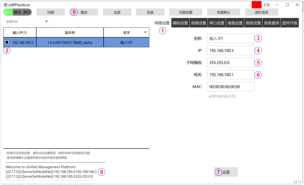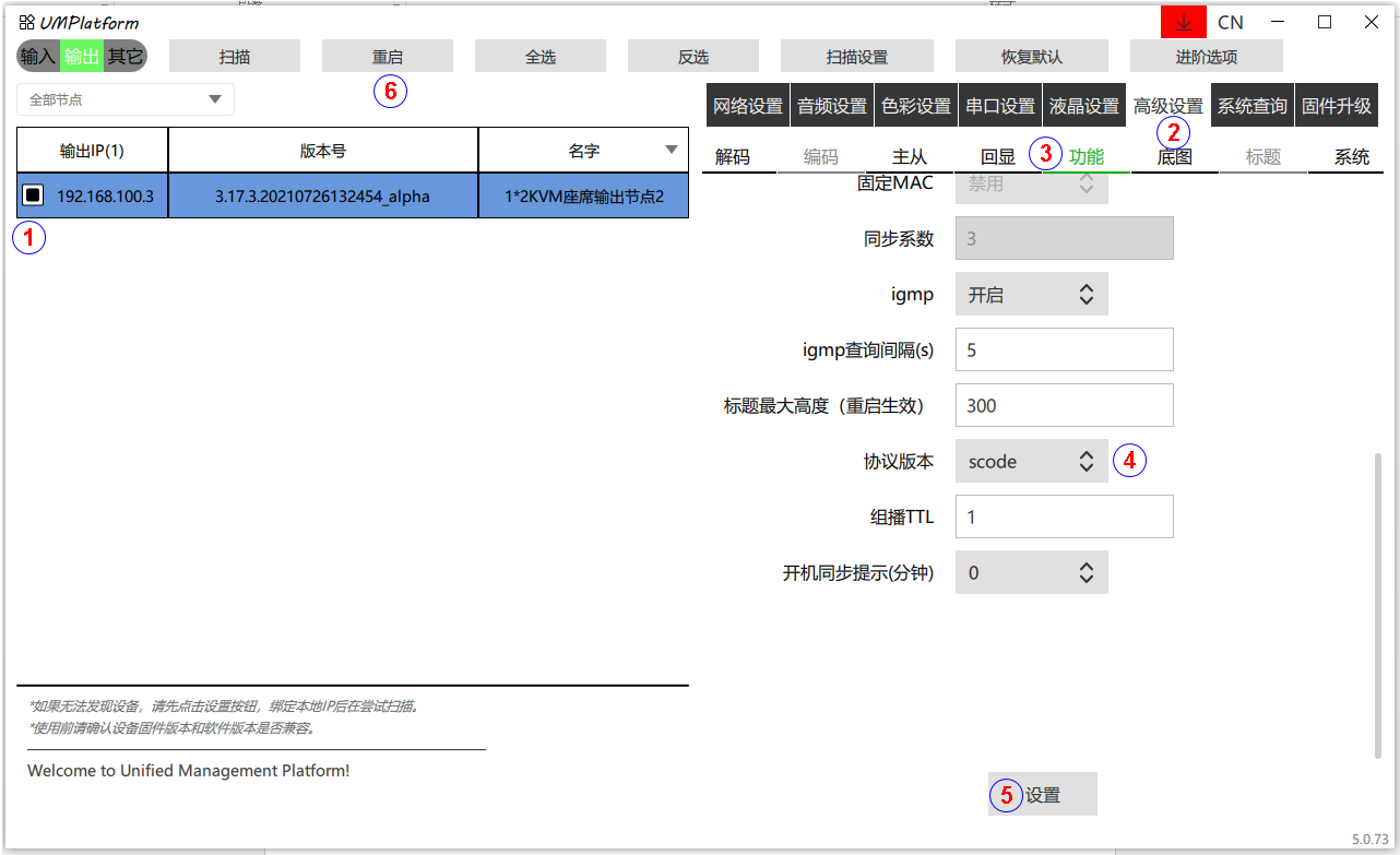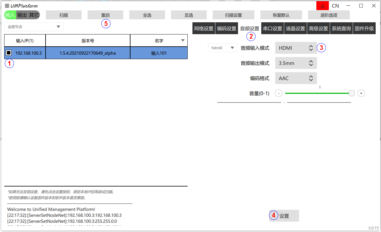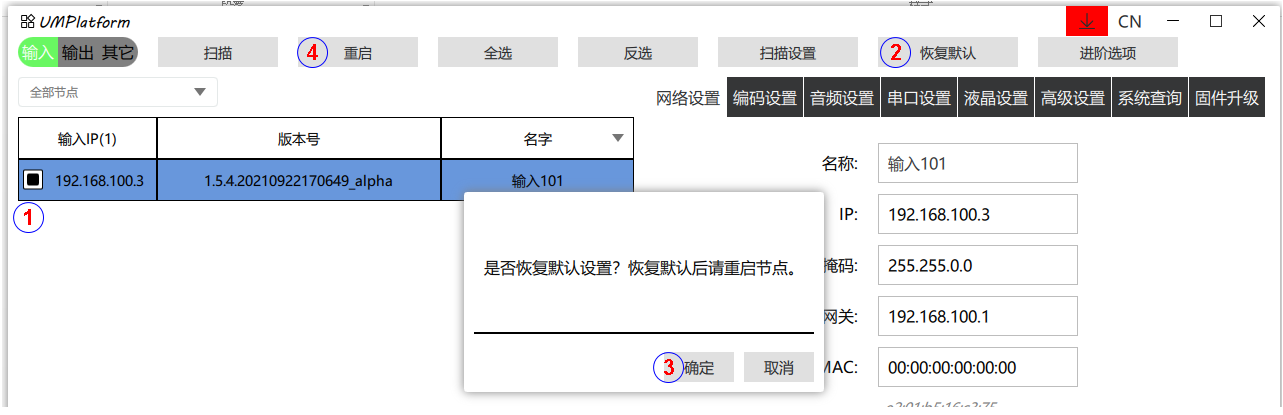 (4) 重啟:對(duì)當(dāng)前輸入/輸出選中的設(shè)備進(jìn)行重啟。部分參數(shù)修改后或升級(jí)后需要重啟。