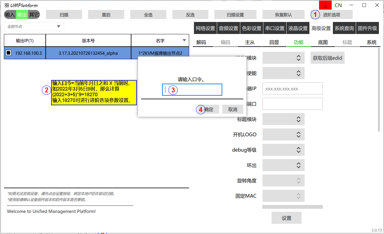 輸入口令=當(dāng)前年月日之和X當(dāng)前時(shí),如2022年3月5日9時(shí),那么計(jì)算(2022+3+5)X 9=18270,輸入口令18270,可以進(jìn)入進(jìn)階選項(xiàng)的參數(shù)設(shè)置。