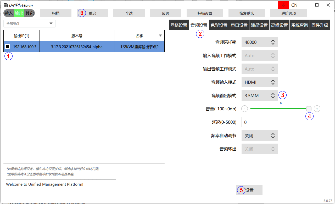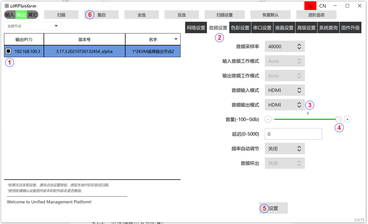 根據(jù)現(xiàn)場(chǎng)的音頻輸出模式選擇HDMI輸出或者3.5mm(3pin鳳凰端子)輸出。同時(shí)把音量調(diào)整到最大(0)。其他參數(shù)不用修改。