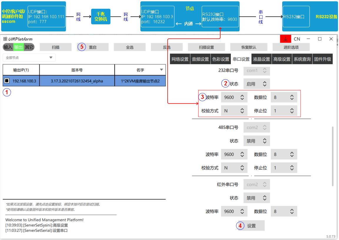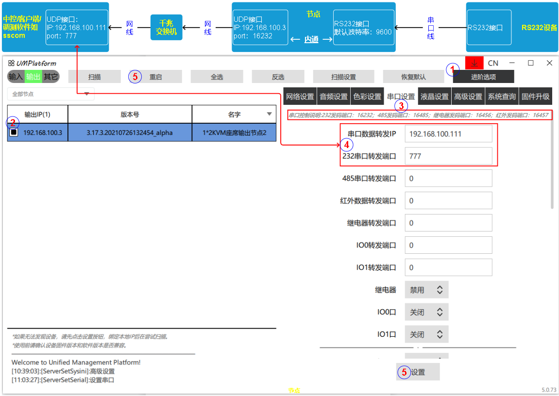 第四步:RS232設(shè)備發(fā)送串口指令,節(jié)點(diǎn)收到串口指令通過(guò)網(wǎng)絡(luò)轉(zhuǎn)發(fā)給網(wǎng)絡(luò)設(shè)備,參數(shù)設(shè)置如下。例:網(wǎng)絡(luò)設(shè)備IP和端口192.168.100.111:777。